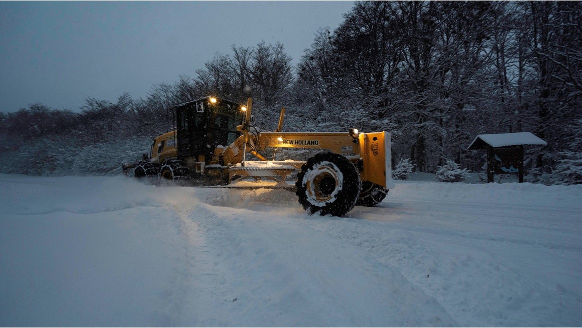 Na região conhecida como Terra do Fogo, uma motoniveladora RG200B executa tarefas de liberação na Rota Nacional 3, entre Ushuaia, capital da província, e a cidade de Tolhuin, no Parque Nacional da Terra do Fogo.