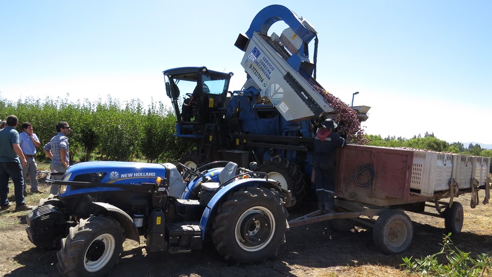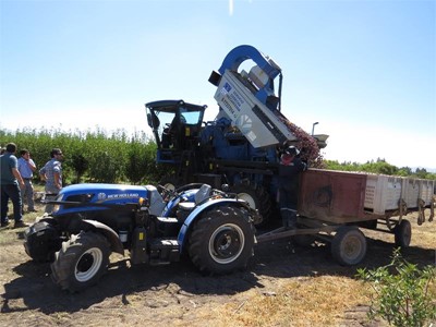 Por primera vez se realizó una recolección de ciruelos D’Agen totalmente mecanizada con una vendimiadora New Holland Braud XV 7090