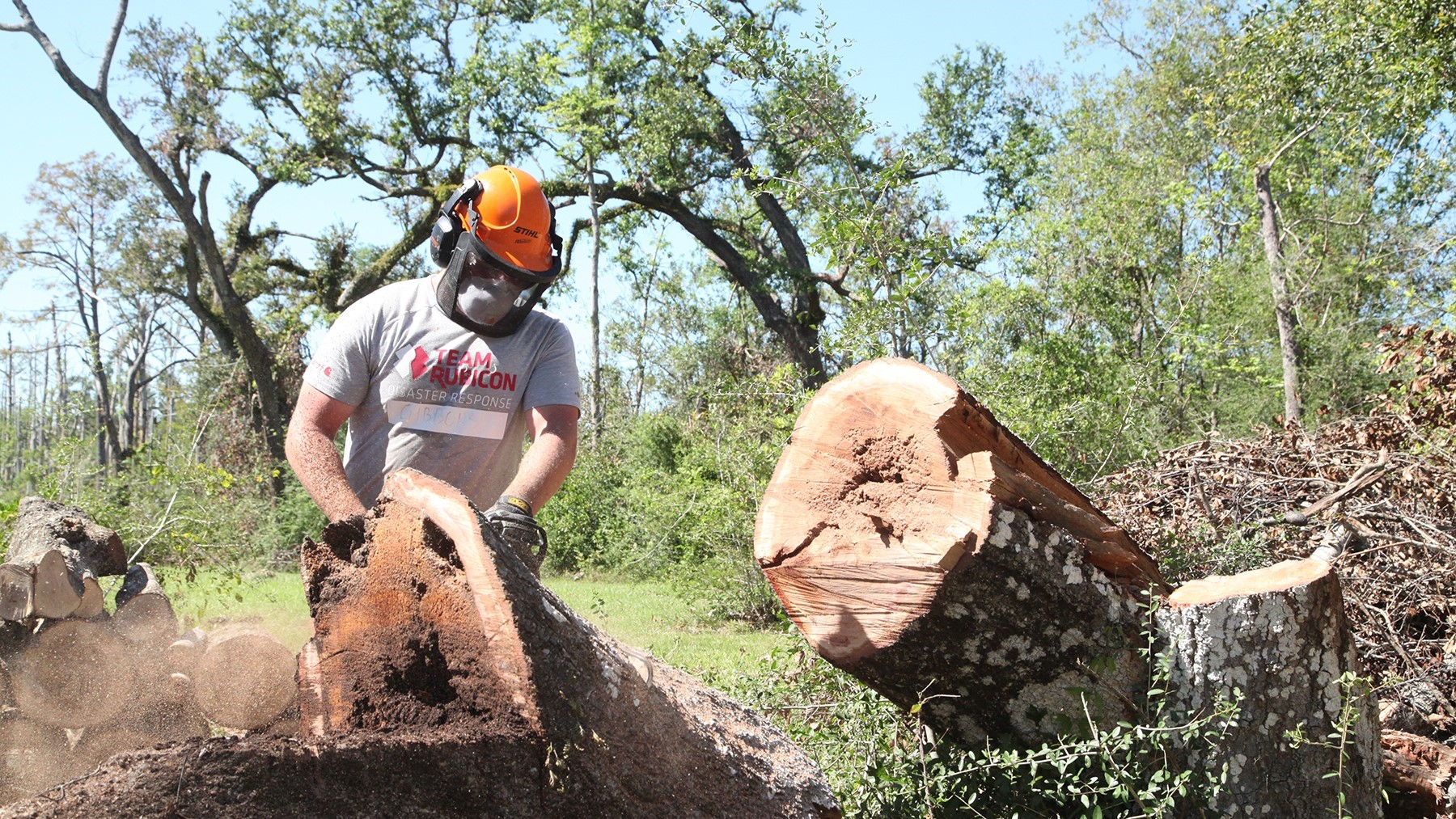 The area was hit with its second major hurricane of the season on October 9, Hurricane Delta, while cleanup operations were still in full swing. Team Rubicon volunteers evacuated and then transitioned to route clearance as they returned to the Lake Charles area. Local equipment support is being provided by CASE dealer Progressive Tractor.