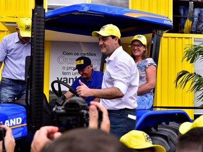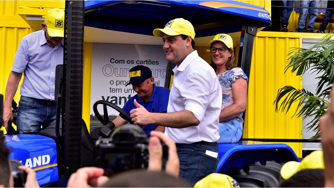 O governador do Paraná, Carlos Massa Ratinho Júnior, entregou nesta quinta-feira (6) as chaves de mais um trator da New Holland Agriculture, marca da CNH Industrial, para um agricultor beneficiado pelo programa Trator Solidário. O programa possibilita o financiamento, com preços mais acessíveis, de equipamentos agrícolas para pequenos produtores. Roque Selzler e sua esposa, Leonete, de Pato Bragado, receberam do governador e do diretor de Mercado Brasil da New Holland Agriculture, Eduardo Kerbauy, as chaves do TL5.80. A marca é uma das principais parceiras do Governo do Paraná no fornecimento de equipamentos agrícolas para o programa Trator Solidário. A cerimônia ocorreu em frente ao estande do Banco do Brasil durante a 32ª edição do Show Rural Coopavel, que começou na segunda-feira (3) e termina na sexta (7).